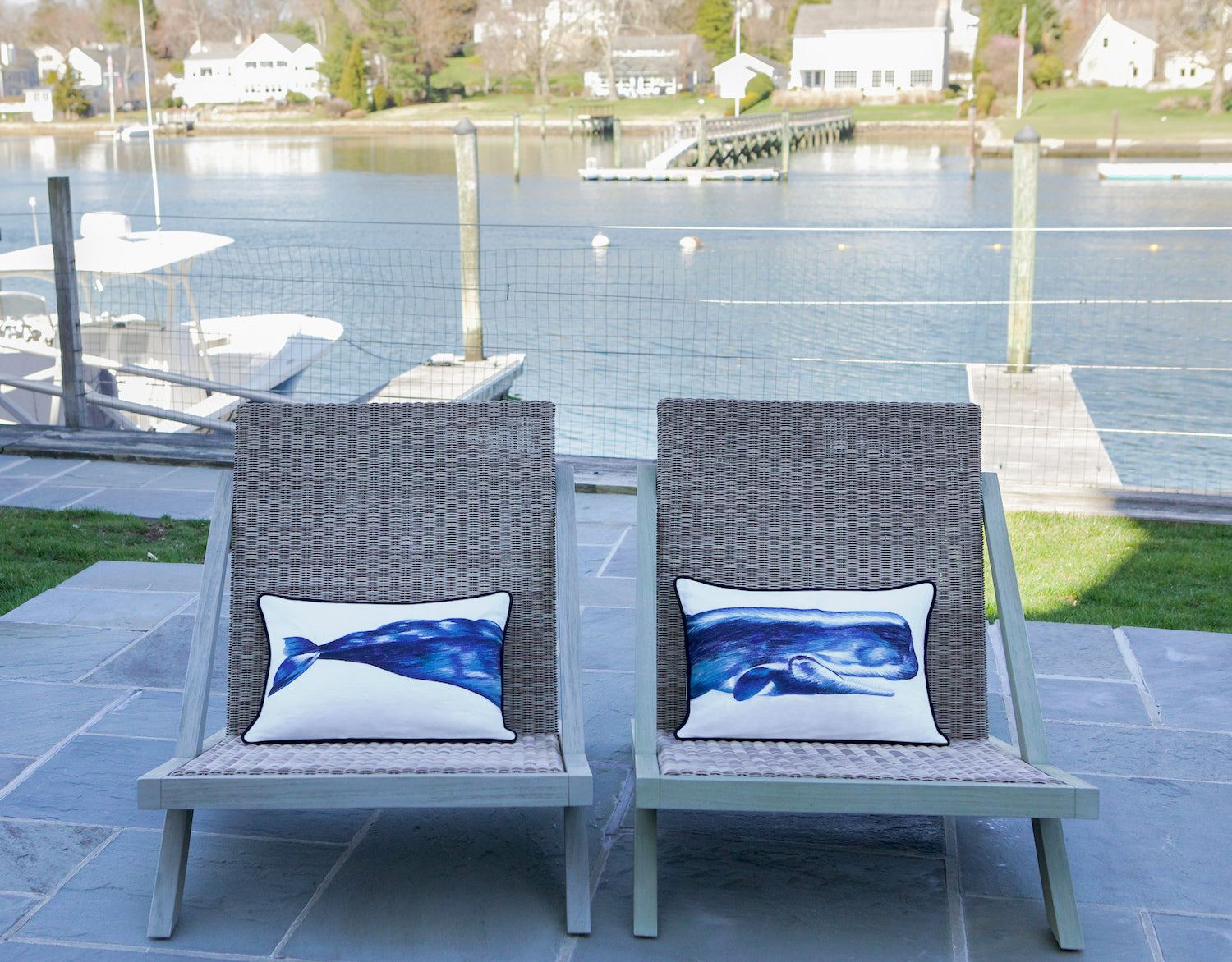 - Our Whale pillow set. Two 12 x 20 pillows embroidered in shades of blue on a ramie line/cotton base.